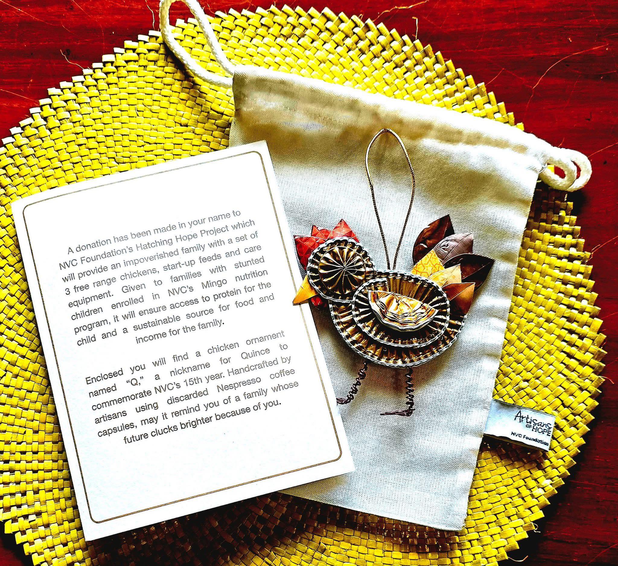 Sponsorship of one set of chickens is P6,000 (about USD105). Donors are given a token ornament in the shape of a chicken named Q.